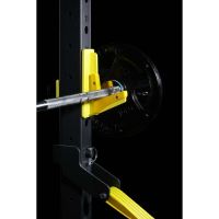 - Страховочный упор имеет размеры 760х95х320 мм. Рама страховочного упора изготовлена из стального листового металла толщиной 8 и 5 мм и стальной профильной трубы 80х80х3 мм. Ось рамы страховочного упора изготовлена из стального круга диаметром 25 мм. Конструкция рамы упора обеспечивает надежную, быструю фиксацию упора на стойке, а винтовой фиксатор позволяет плотно прижать упор к стойке. Наличие на упоре накладки из монолитного поликарбоната оберегает гриф от повреждений. Все листовые детали и детали из трубы изготовлены на высокоточном лазерном оборудовании.