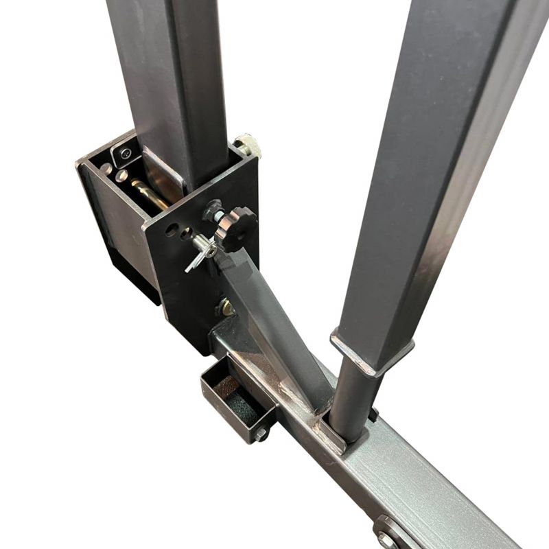- Домкратный рычажный механизм выполнен из труб 50×50×3 мм и Ø42 с толщиной стенки 3 мм и элементами из листового металла толщиной 5 мм. Система рычагов с осевыми шарнирами позволяет плавно изменять высоту положения штанги без снятия грифа, обеспечивая точную настройку под рост спортсмена.