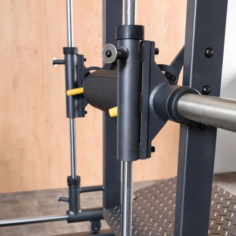 - Пара направляющих для плавного движения грифа с валиком для фиксации бёдер по вертикали выполнены из нержавеющей трубы.