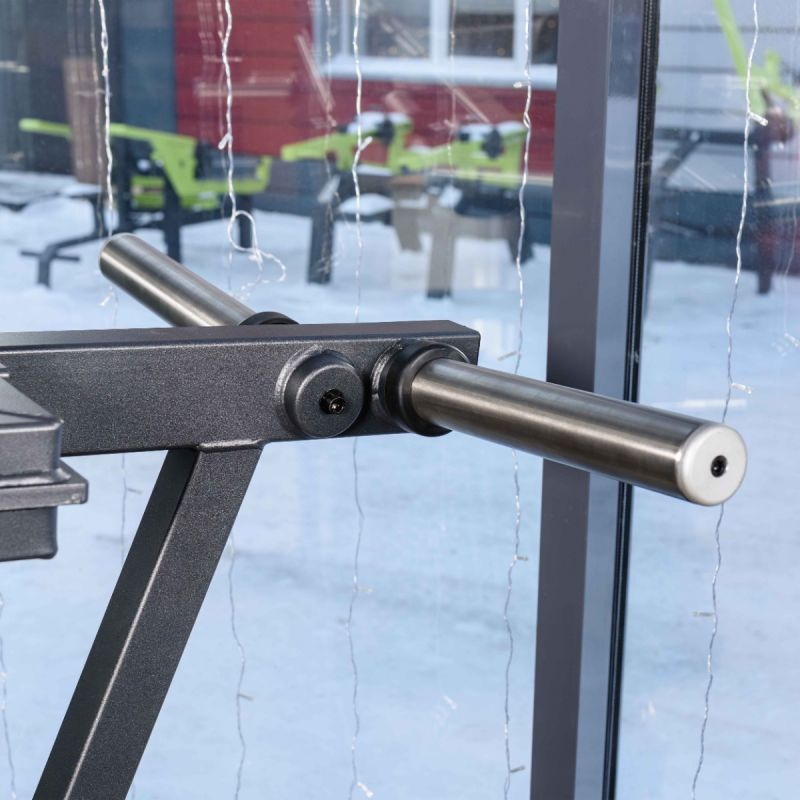 - Рукояти, расположенные около плечевых подушек, выполнены из стального прутка с обрезиненным покрытием и оснащены торцевыми заглушками, зафиксированными болтовым соединением.