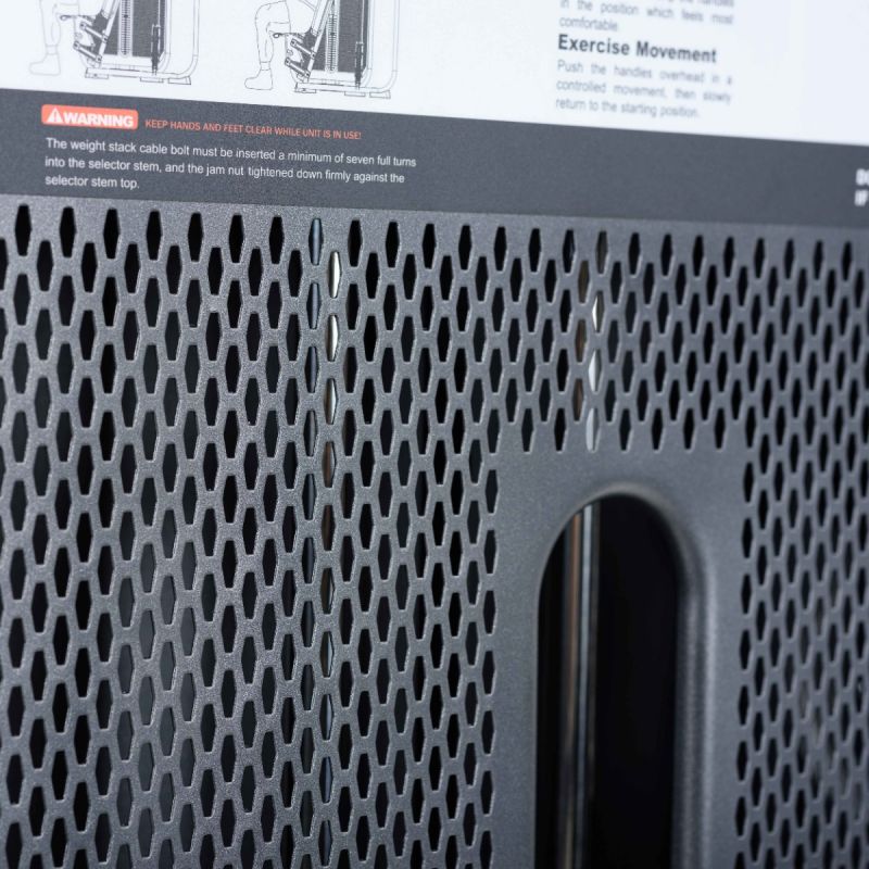 - Металлическая перфорированная защита весового стека с лицевой стороны и сплошная защита с внешней стороны выполнена из листового металла толщиной 2 мм. Для повышения эксплуатационных параметров тренажера в восьми точках у основания установлены ребра жесткости, примыкающие к несущей раме через скрытое болтовое соединение сечением 6 мм.