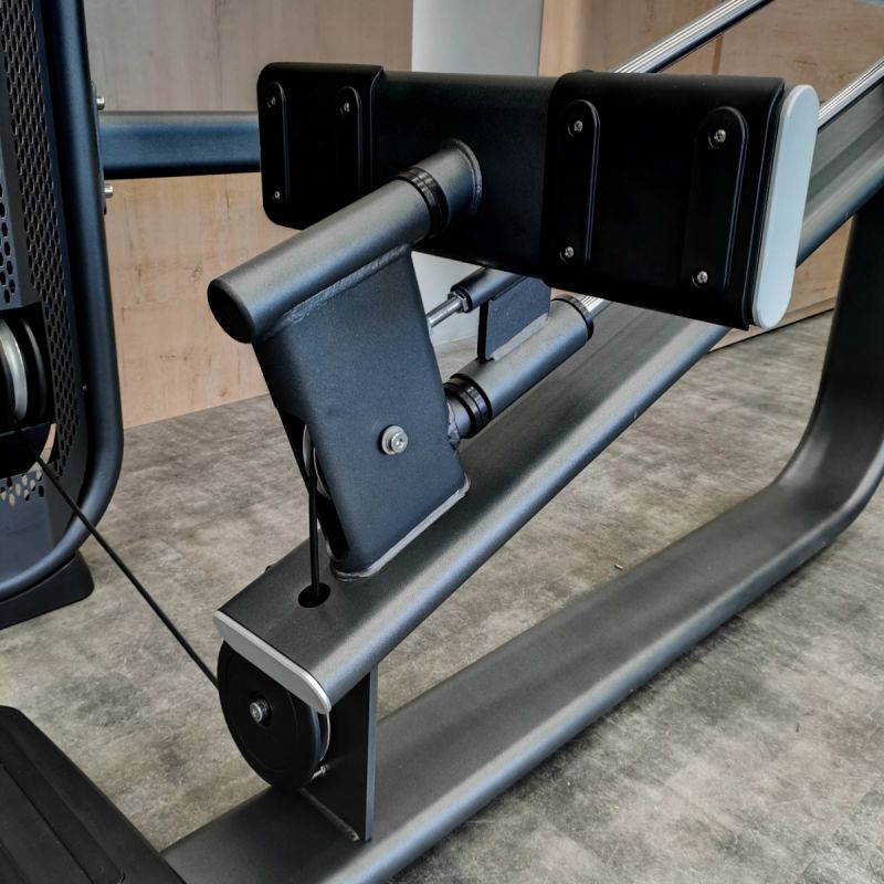 - Рычаг для ног, оборудованный нескользящими пластиковыми вставками с рифленой поверхностью для устойчивого положения, движется по нелинейной траектории, тем самым обеспечивает концентрацию на целевых мышцах.