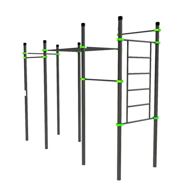 Сбалансированный и компактный комплекс для развития силы, выносливости и ловкости. Продуманное сочетание горизонтальных перекладин, шведской стенки и рукохода обеспечивает всестороннюю тренировку верхней части тела, включая плечевой пояс, мышцы кора и спины. Комплекс рассчитан на одновременные занятия до 7 человек.