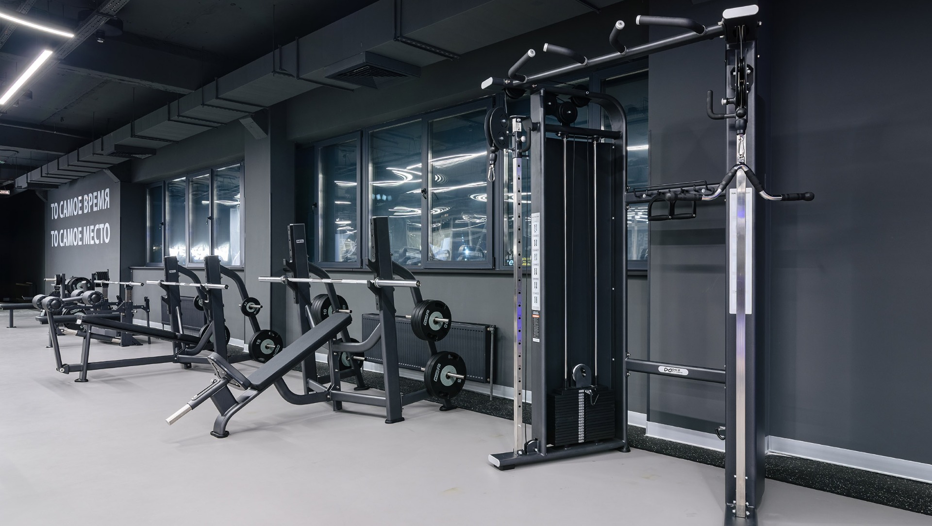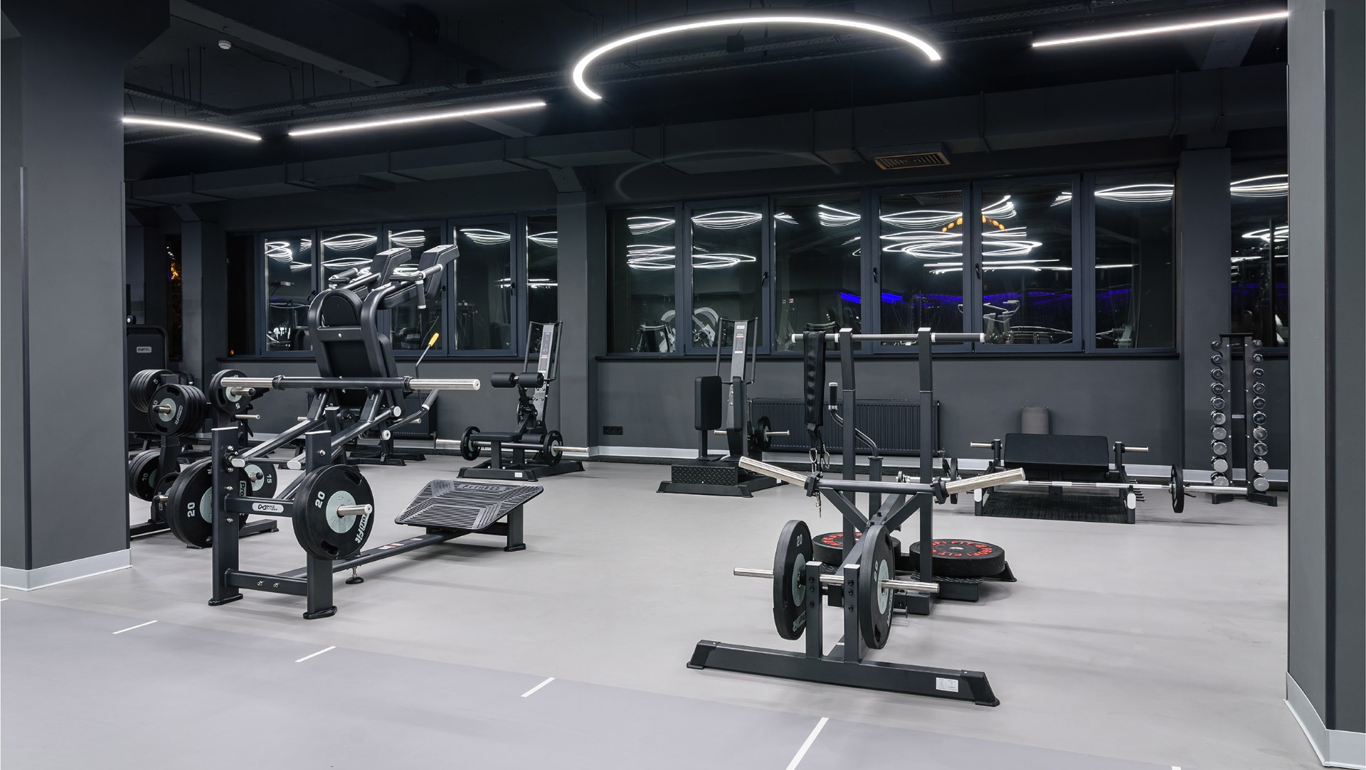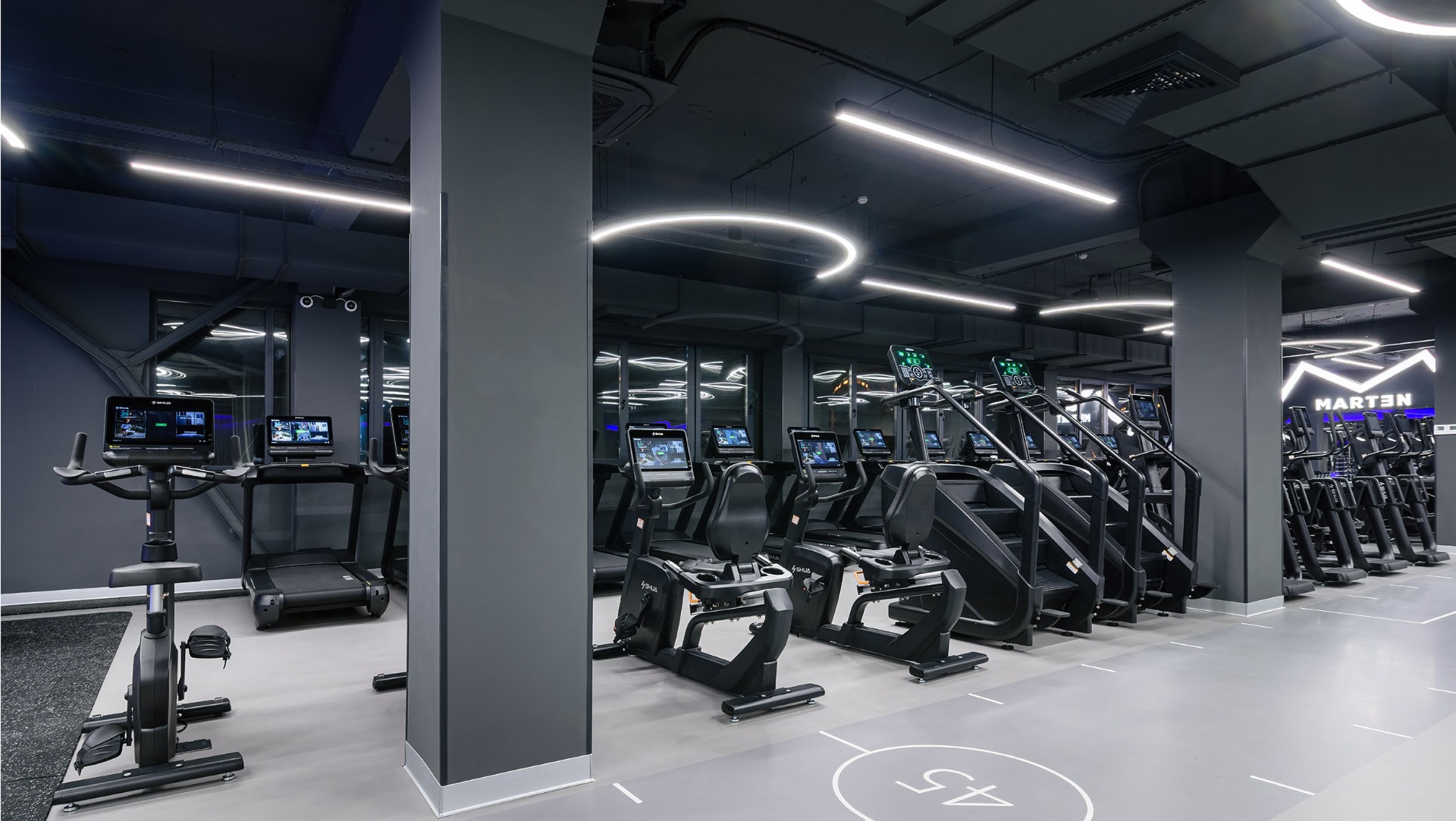 Для оснащения выбраны линейки DHZ Fitness – E7000, U3000D, D900, D600, A600, A2000-A3000, а также кардиооборудование SHUA. Несмотря на разнообразие серий, оборудование формирует единый визуальный и функциональный стиль зала.