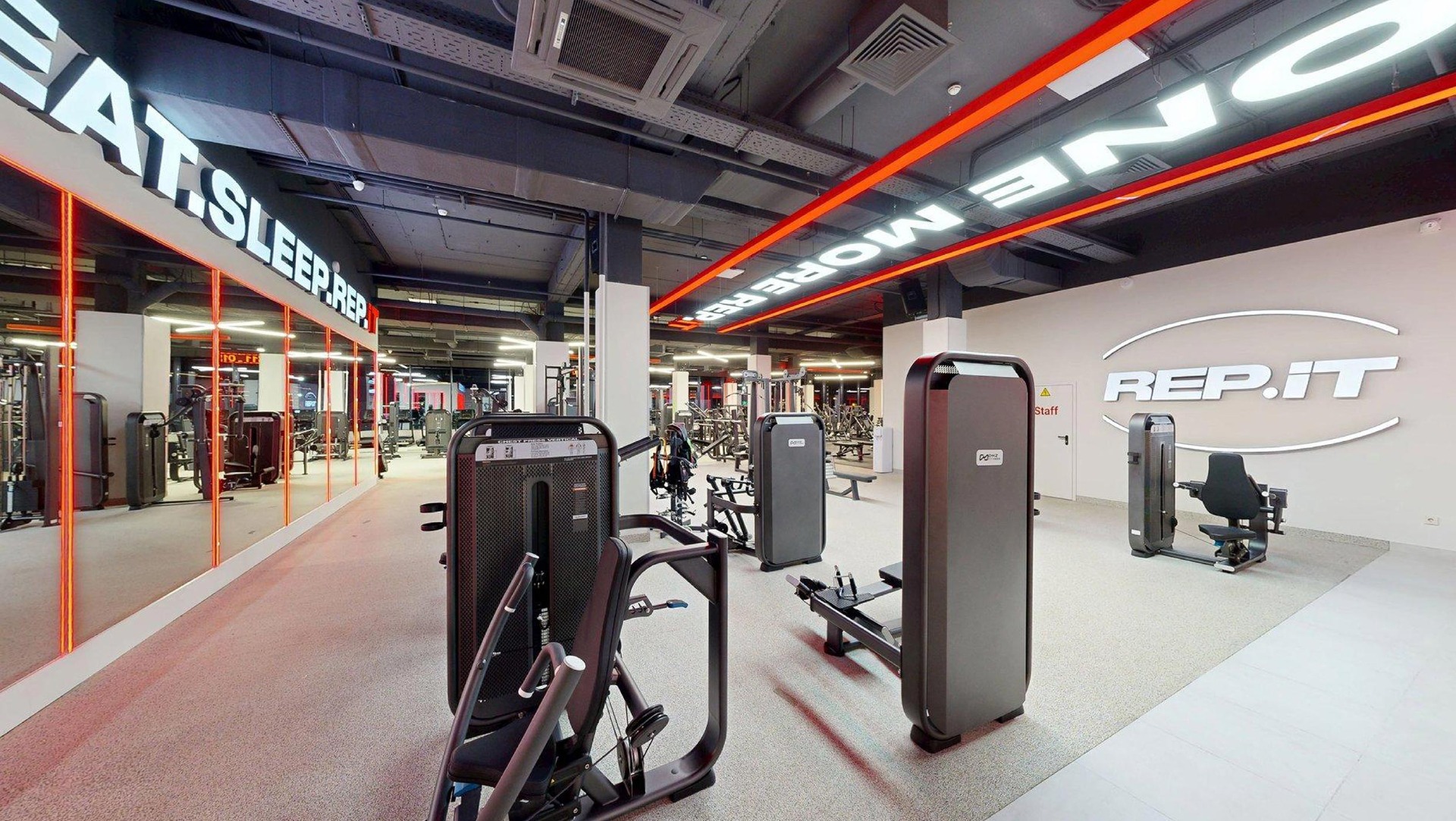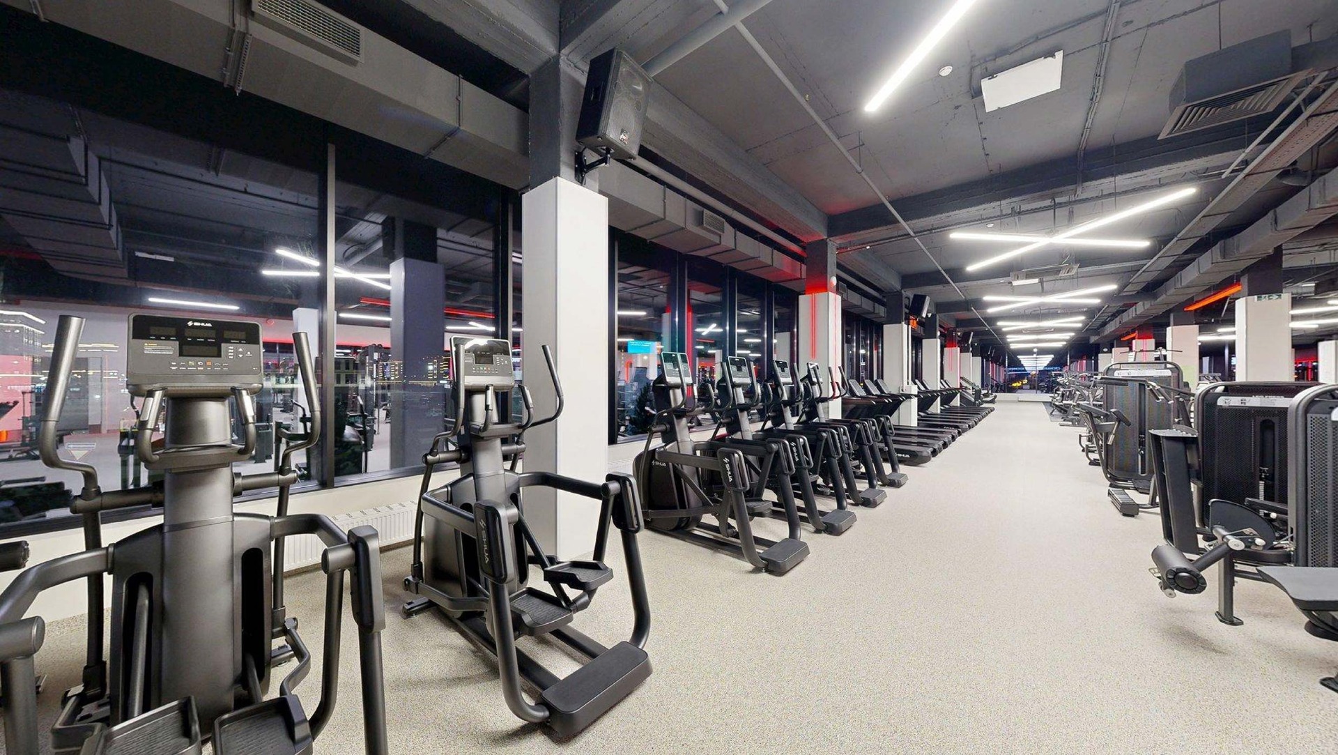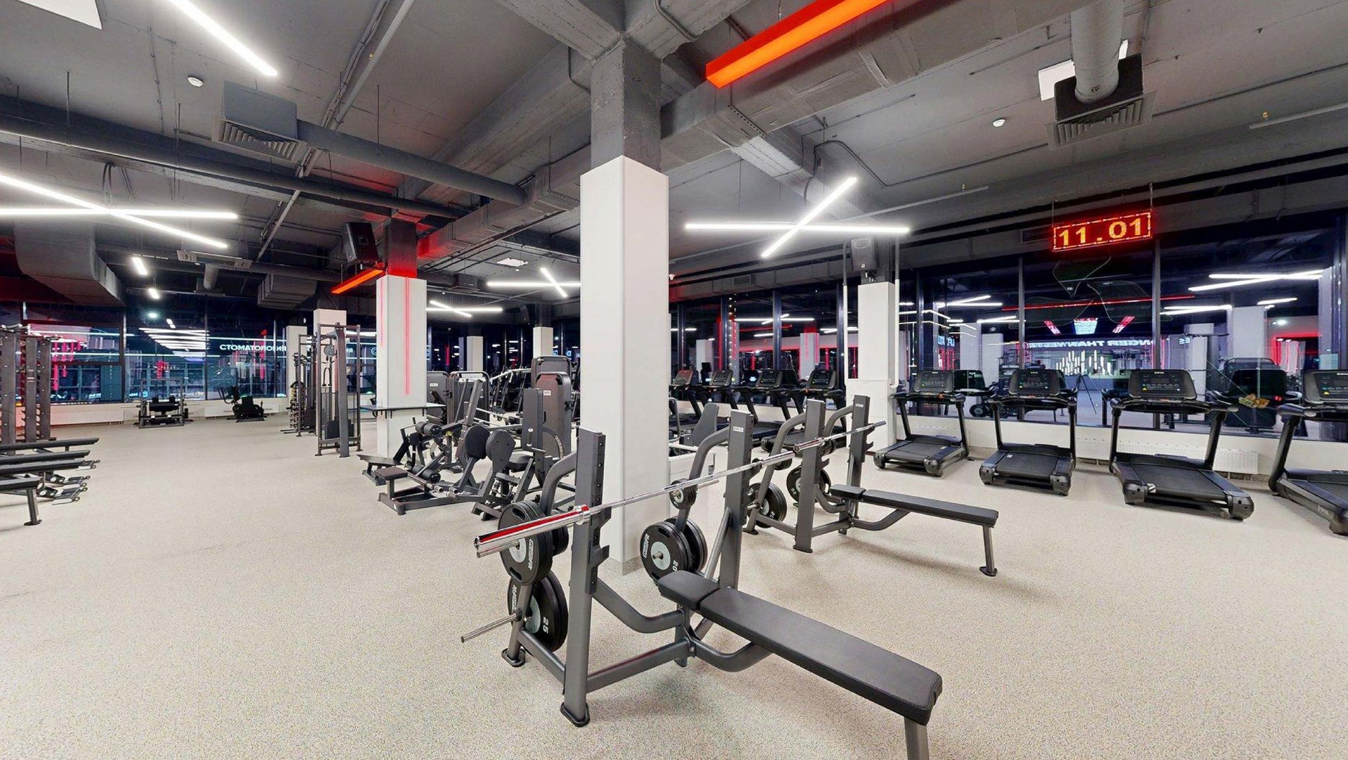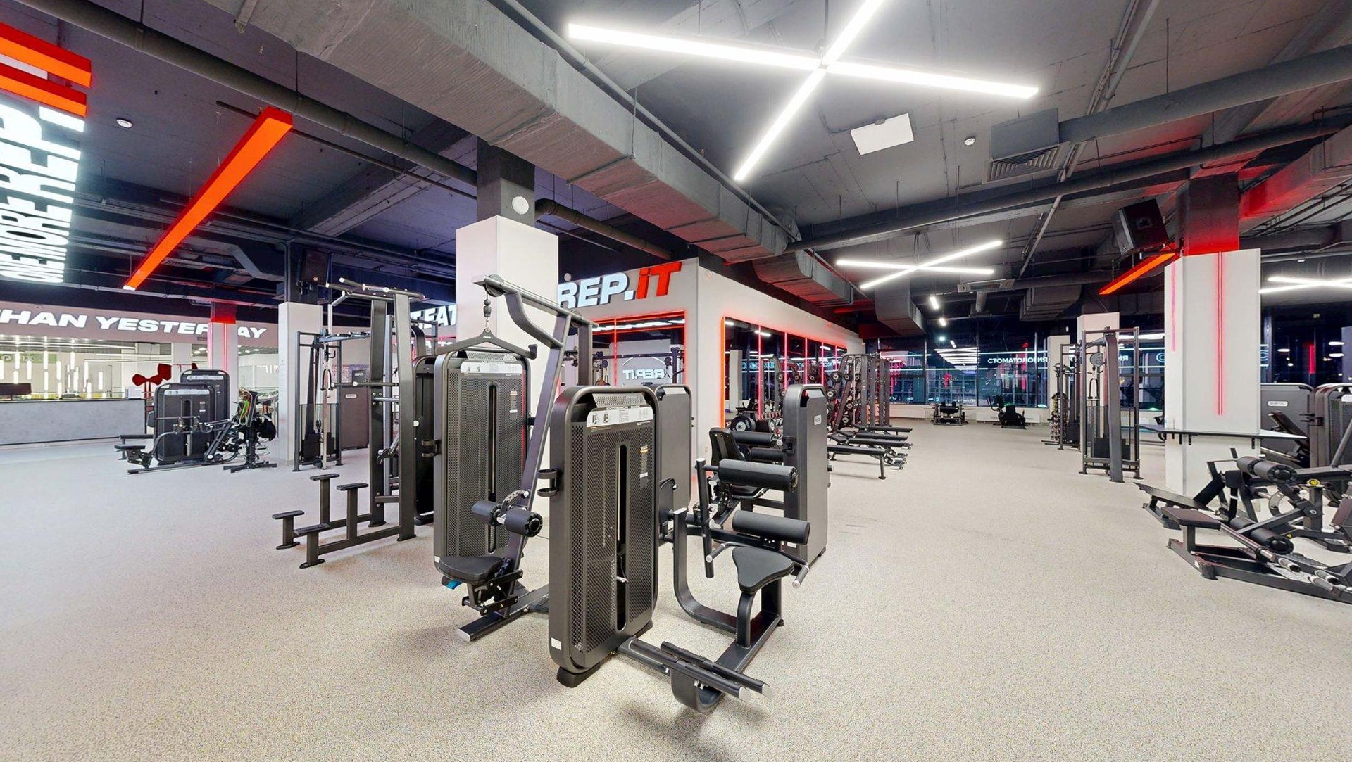Кардиооборудование представлено брендом SHUA. Силовая зона оснащена грузоблочными тренажёрами, скамьями и стойками серии E7000 DHZ Fitness, а также рычажными тренажёрами SM2000–SM3000 и A600. Значительная часть зала отведена под тяжёлую атлетику: установлены полиуретановые гантельные ряды с дублирующими наборами популярных весов, диски, рукояти и системы хранения ТАНГЕН.