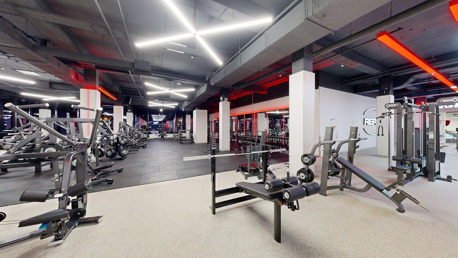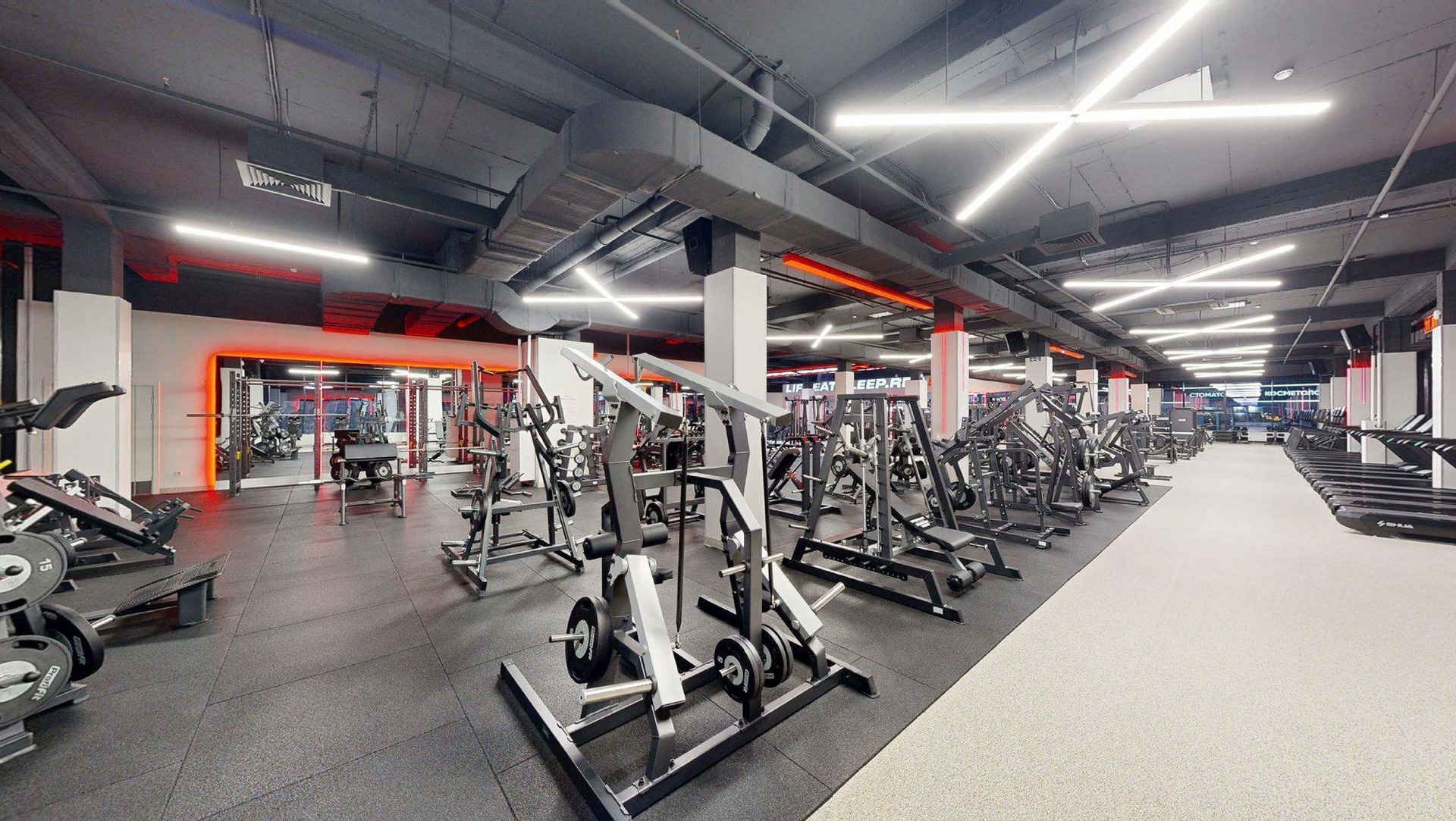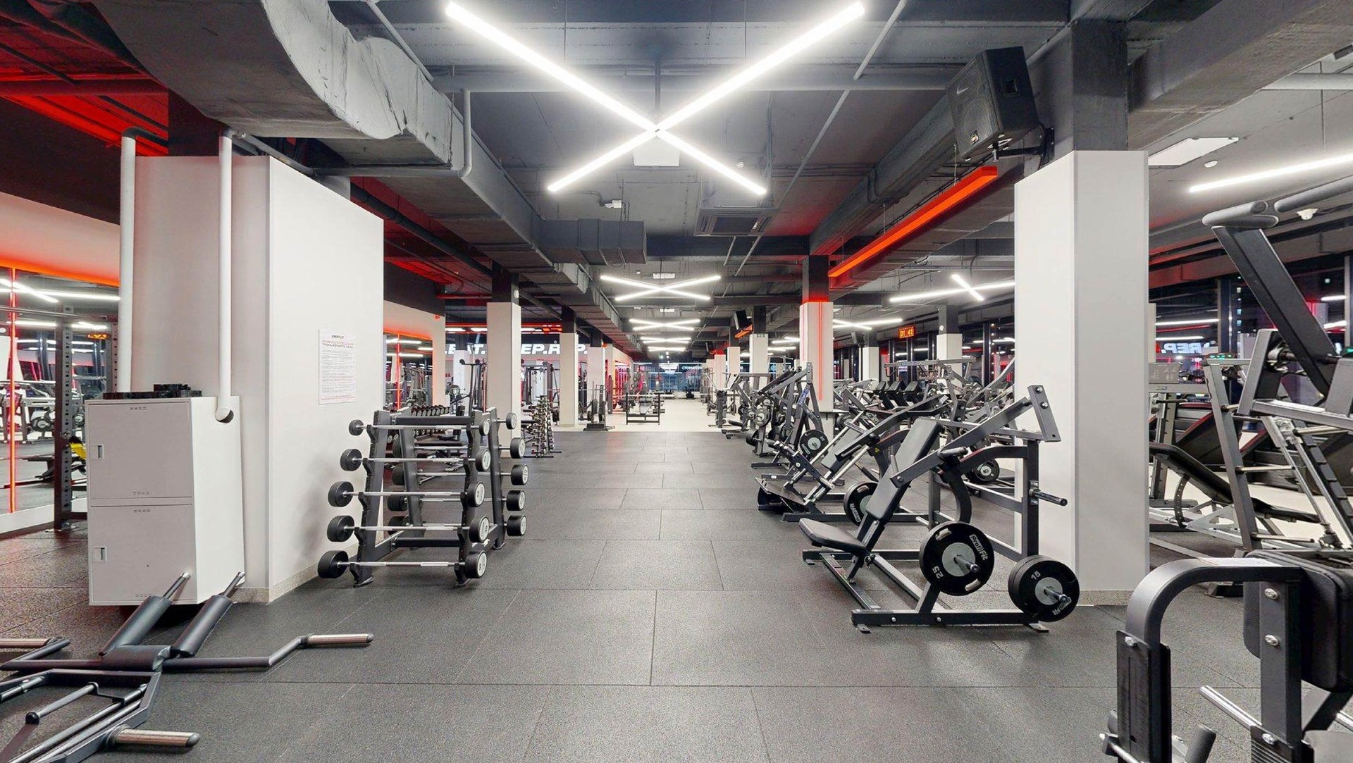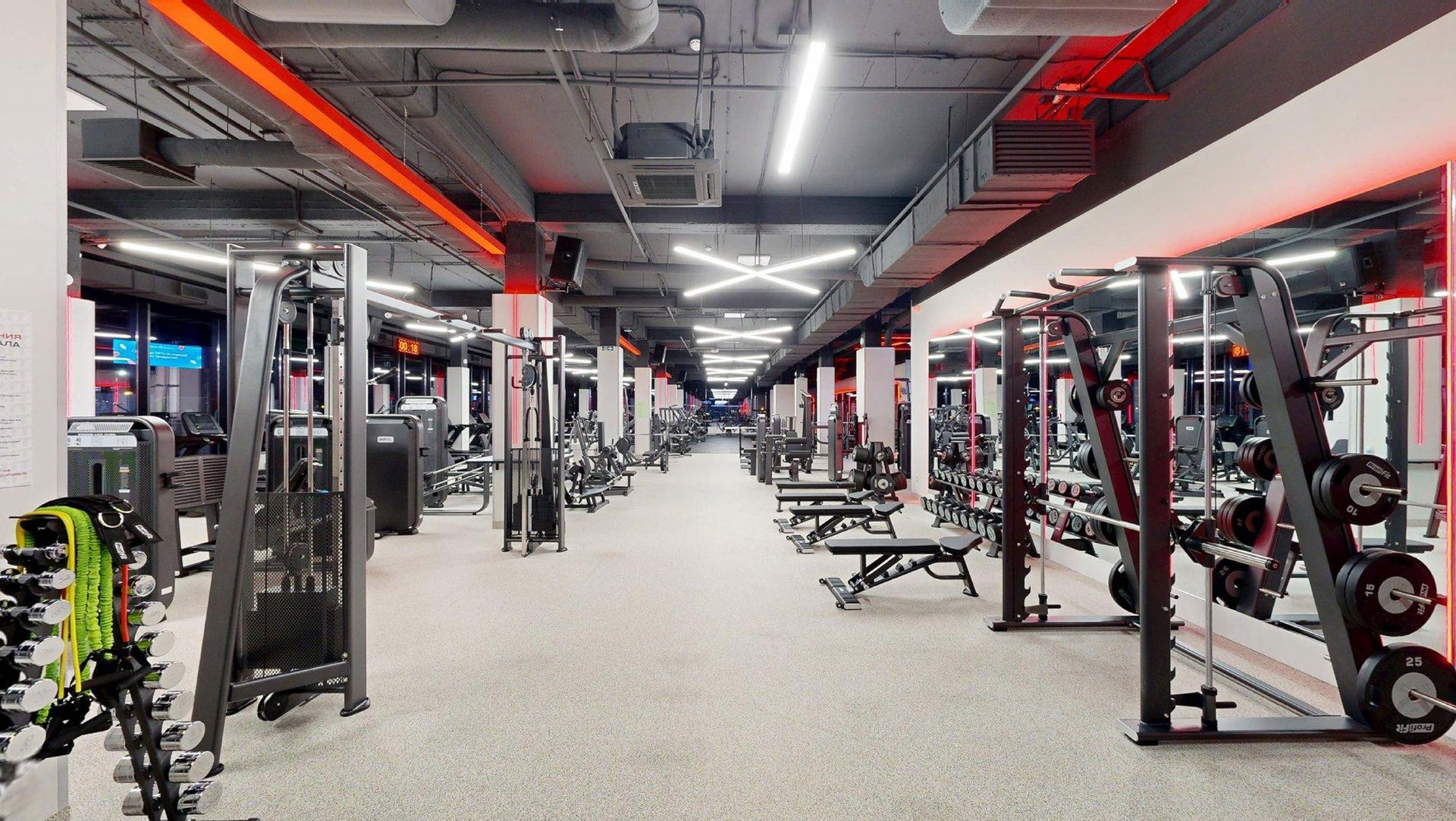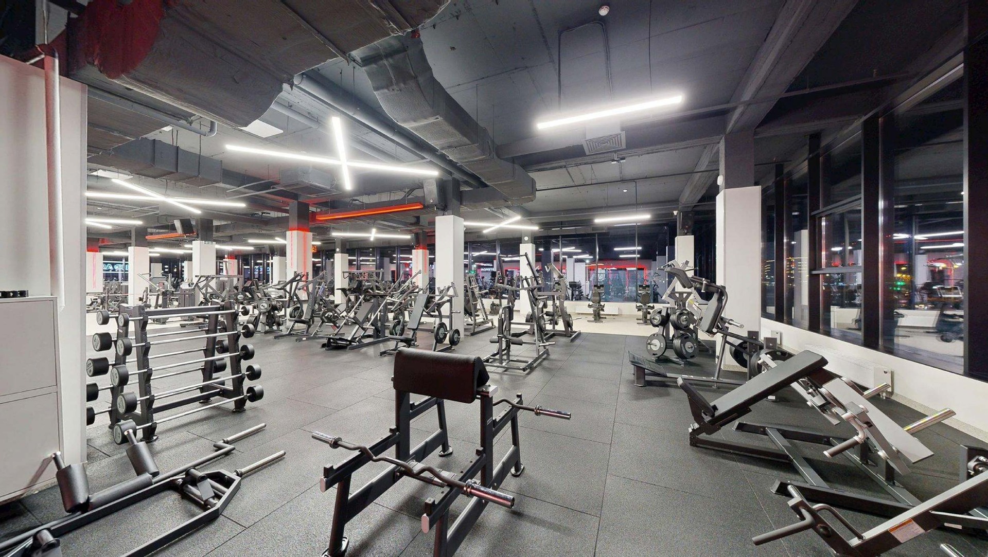Просторный тренажёрный зал с акцентом на силовой тренинг и работу со свободными весами. Интерьер в светлых тонах подчёркивает статус клуба и гармонично дополняет дизайн оборудования DHZ Fitness.