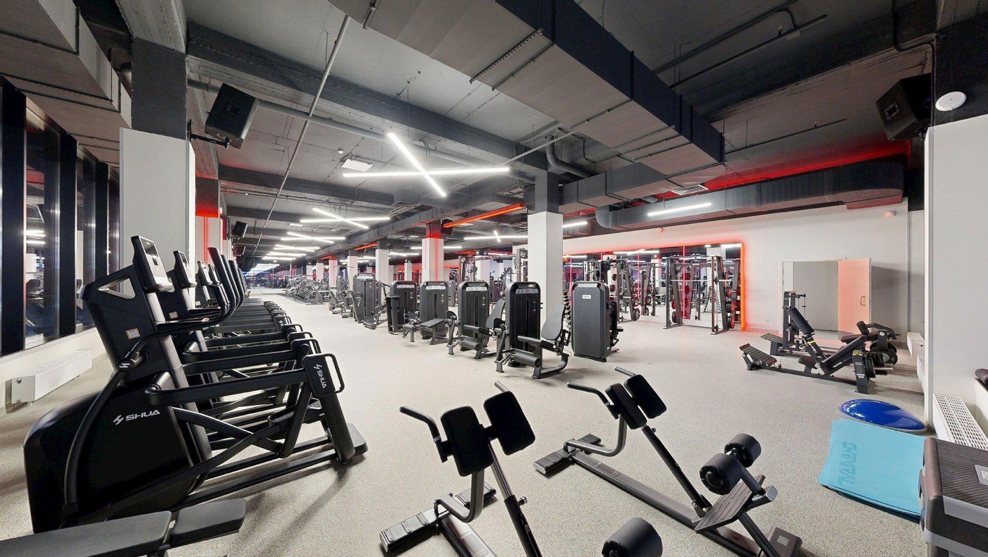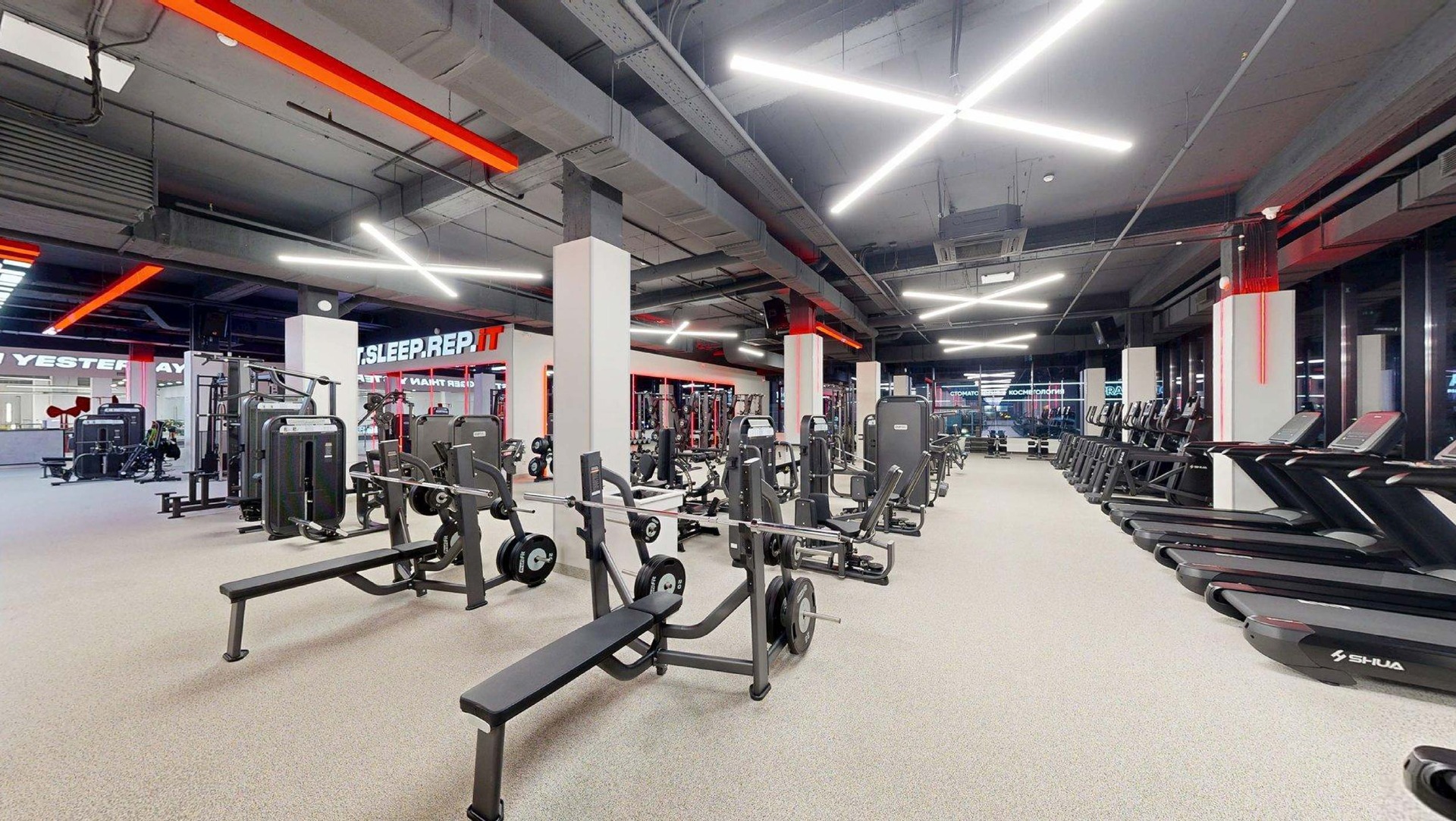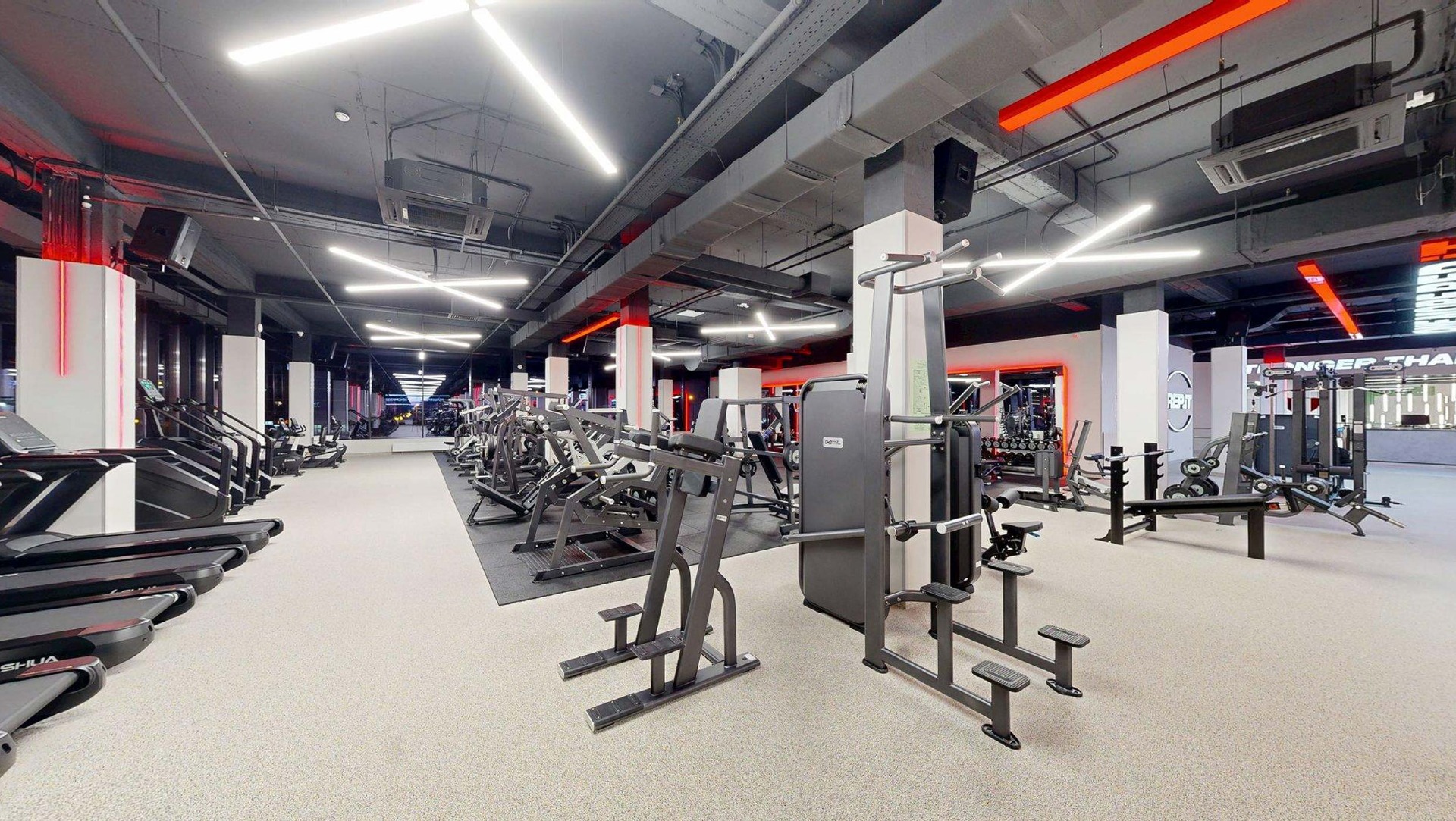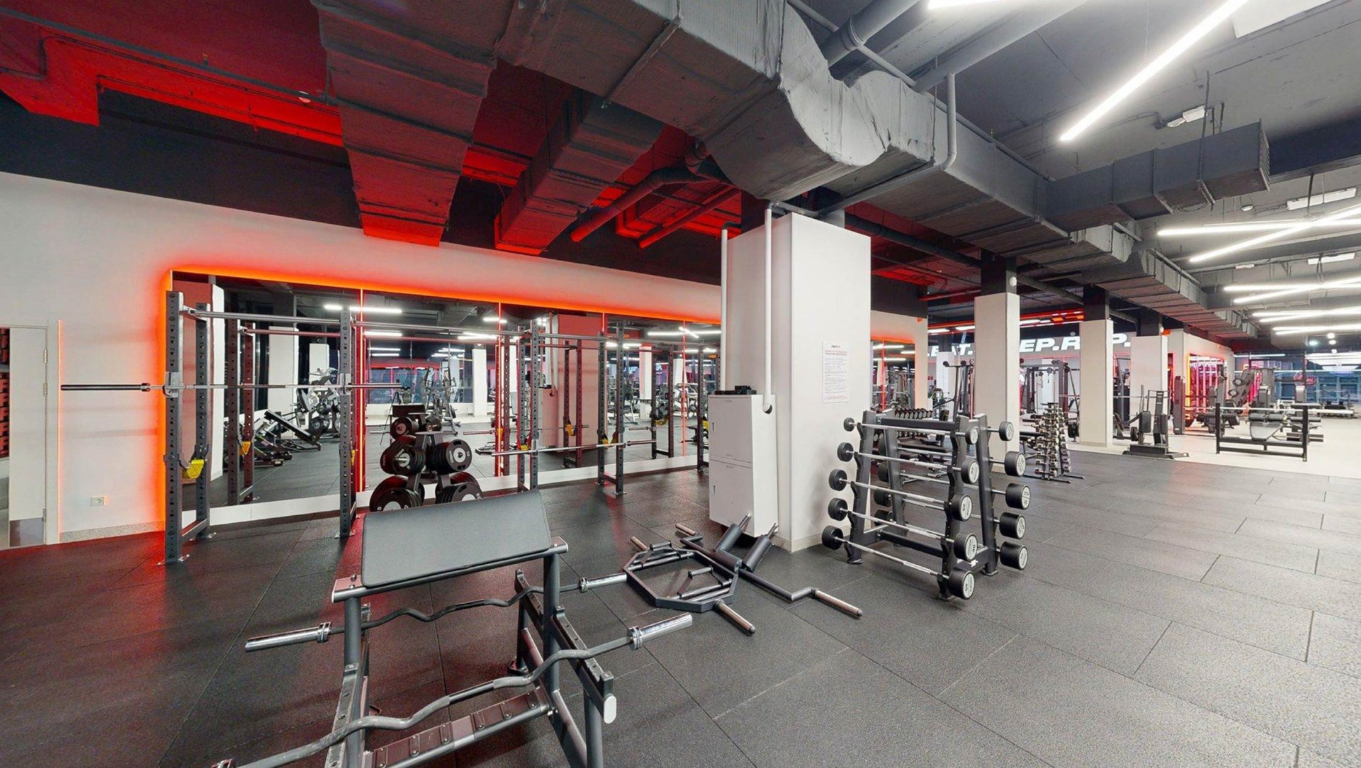 Просторный тренажёрный зал с акцентом на силовой тренинг и работу со свободными весами. Интерьер в светлых тонах подчёркивает статус клуба и гармонично дополняет дизайн оборудования DHZ Fitness.