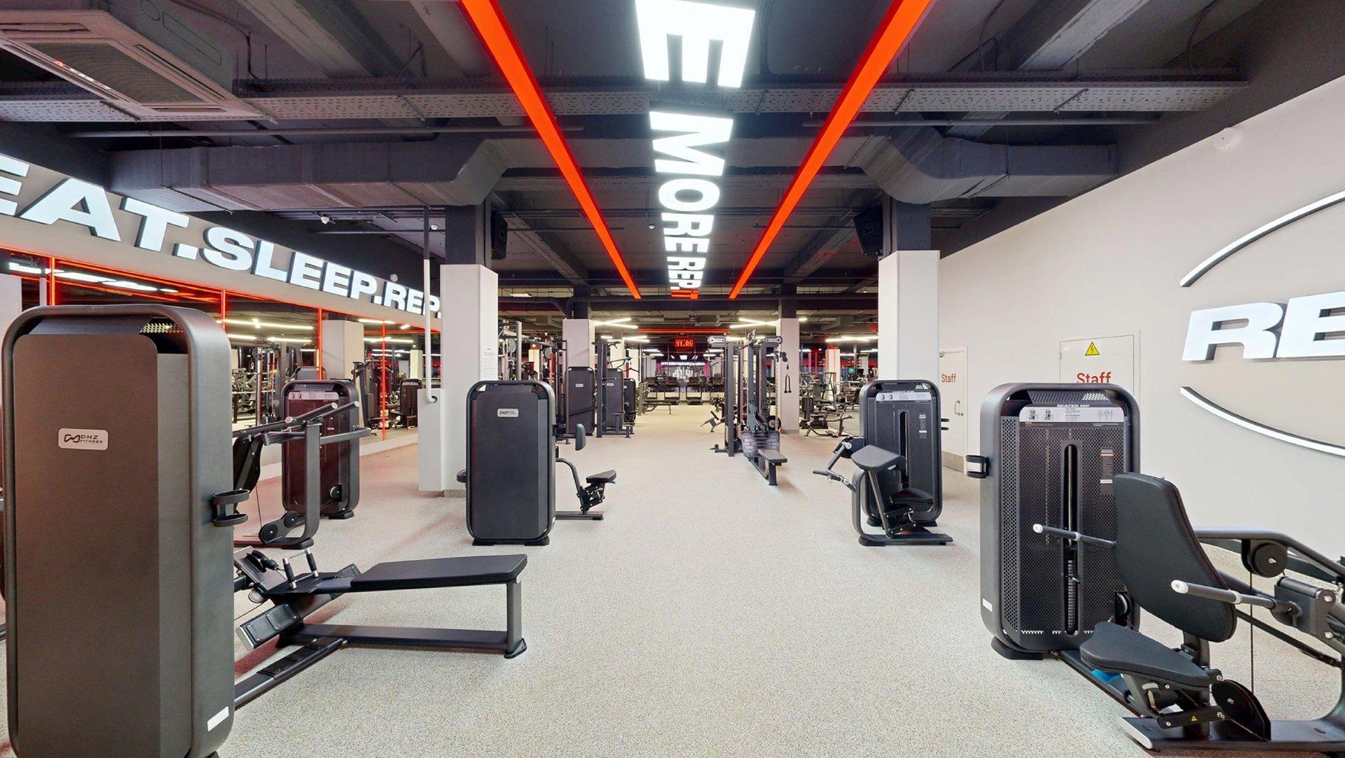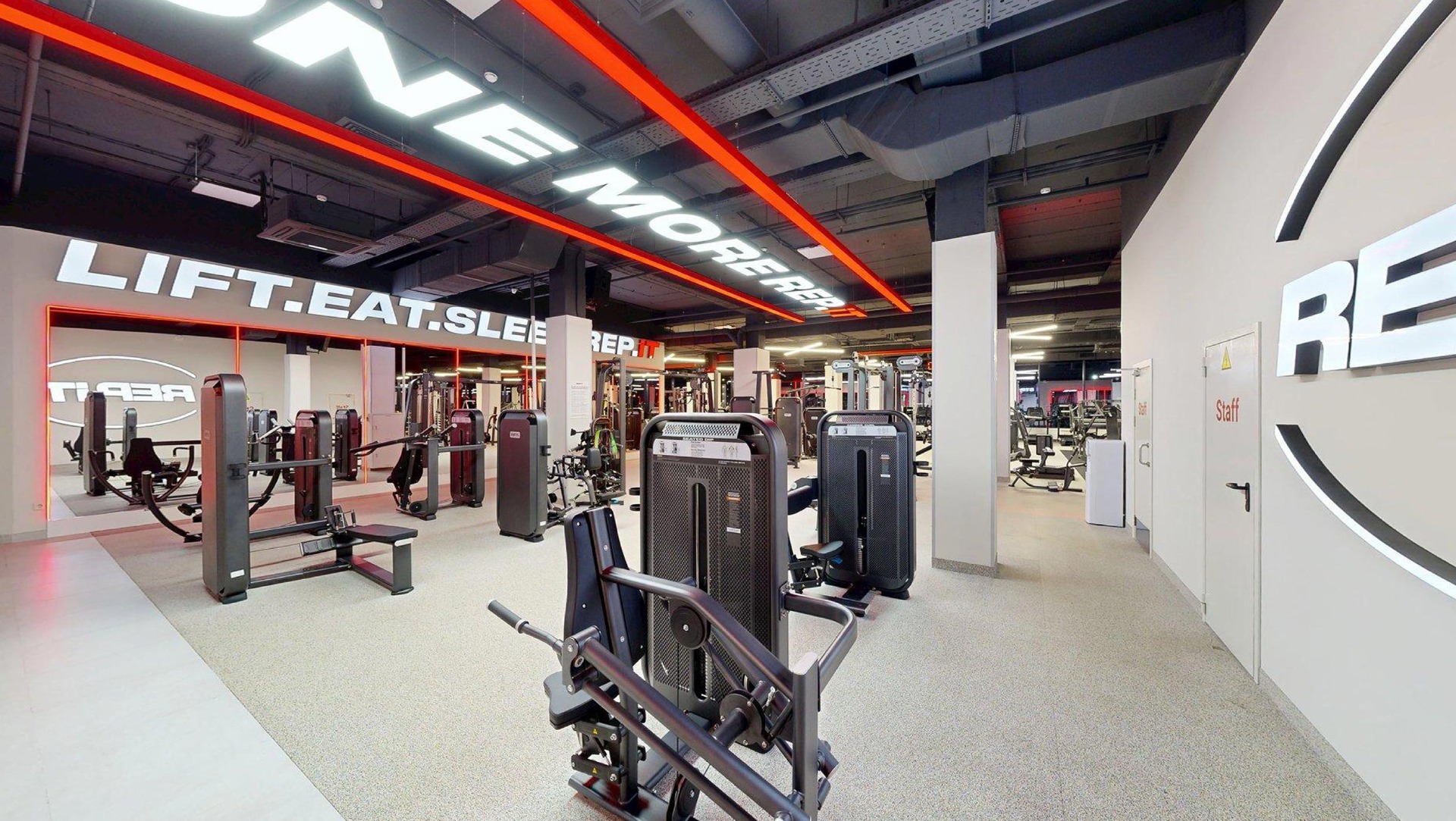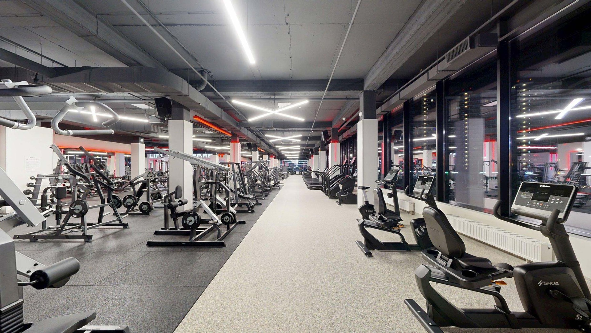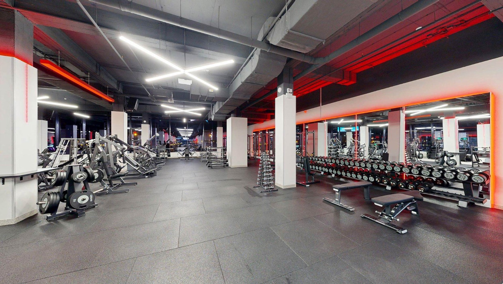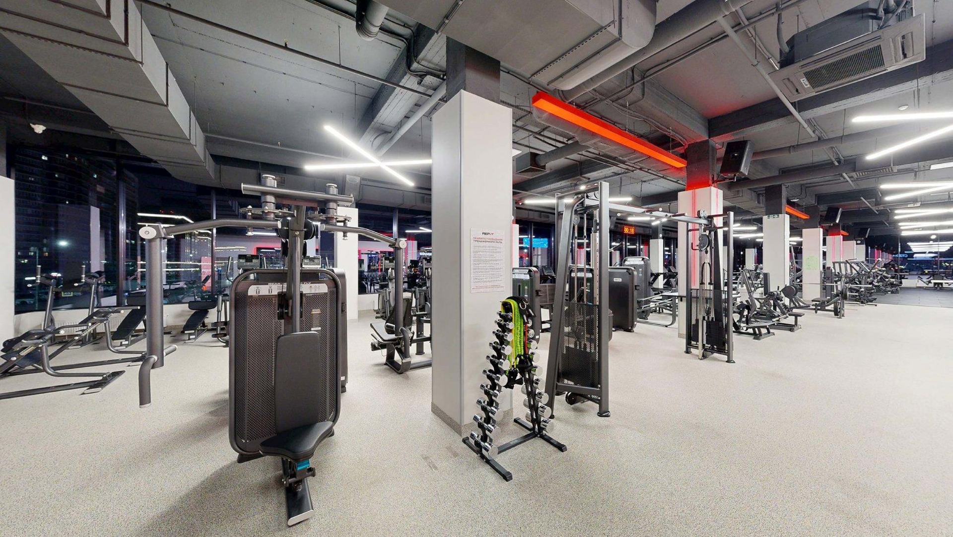 Просторный тренажёрный зал с акцентом на силовой тренинг и работу со свободными весами. Интерьер в светлых тонах подчёркивает статус клуба и гармонично дополняет дизайн оборудования DHZ Fitness.