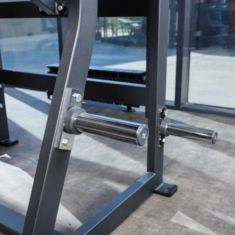 - Два хромированных накопителя на подвижных рычагах оборудованы металлическими держателями для фиксации свободных весов. Стартовое сопротивление 0,5 кг на один рычаг. На торцах накопителей установлены заглушки из пластика.