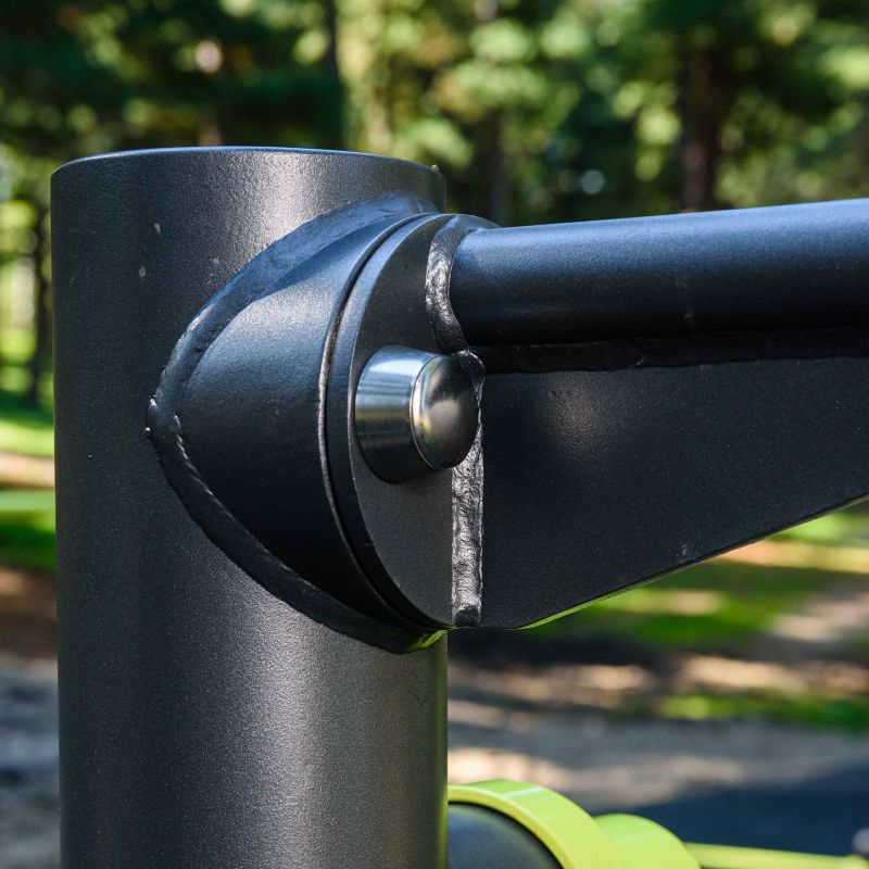 - Механизм ограничения амплитуды движения с фиксированным углом хода 60° предотвращает чрезмерное отклонение рабочих рычагов, исключая возможность травмирования пользователя и снижая ударные нагрузки на конструкцию. Дополнительно выполняет функцию антивандальной защиты, исключая контакт подвижных элементов между собой.