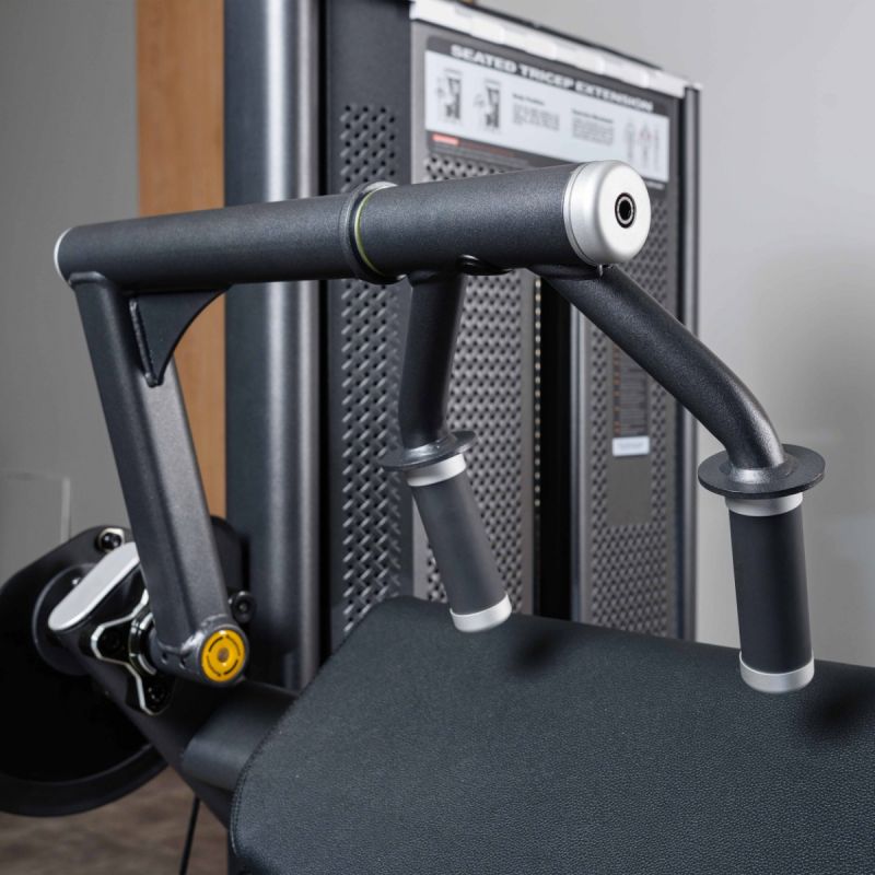 Тренажер Трицепс-машина сидя с наклонной партой предназначен для выполнения изолирующего упражнения по заданной траектории без риска травмирования локтевого сустава. Нагрузку при занятии на тренажере равномерно получает трехглавая группа мышц – длинная, латеральная и медиальная. Тренажер обеспечивает фиксацию положения тела с наклонном вперед.
