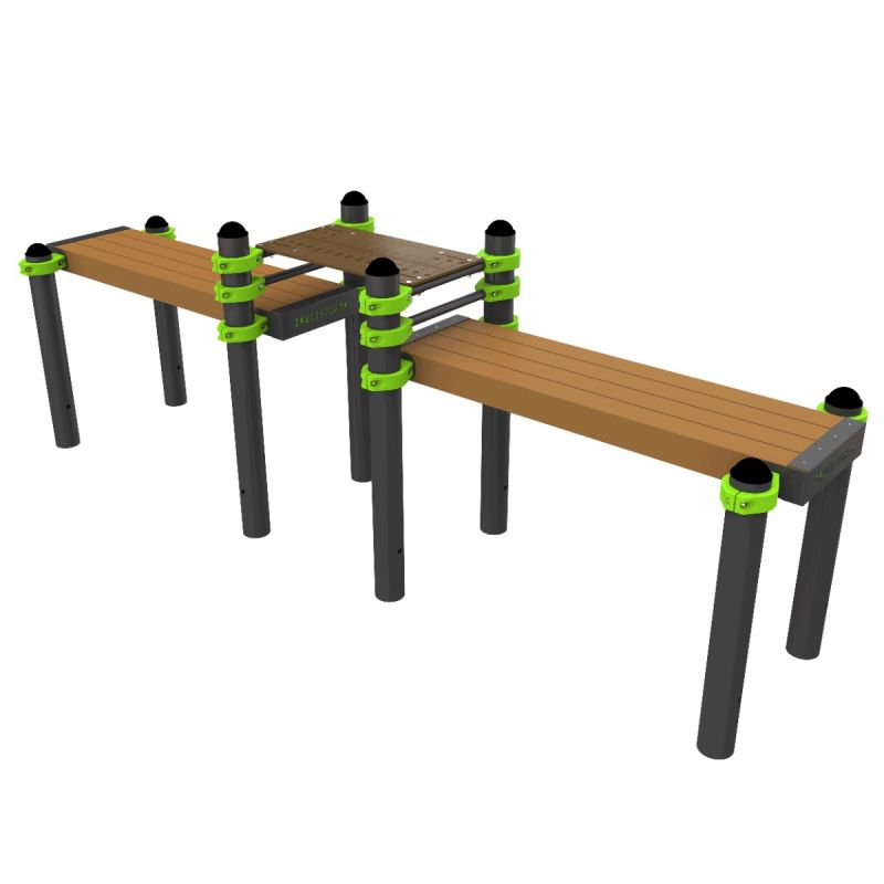 - В состав комплекса входят две горизонтальные скамьи 1500×415×100 мм каждая. Скамьи выполнены из древесно-полимерного композита (ДПК), предназначенного для круглогодичной эксплуатации на открытом воздухе. Материал устойчив к воздействию влаги, ультрафиолетового излучения и перепадам температур, не подвержен гниению и не требует дополнительного обслуживания.